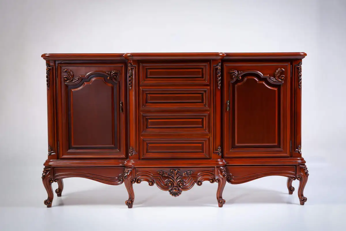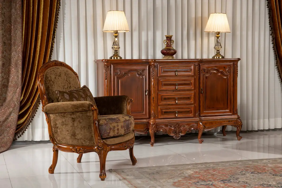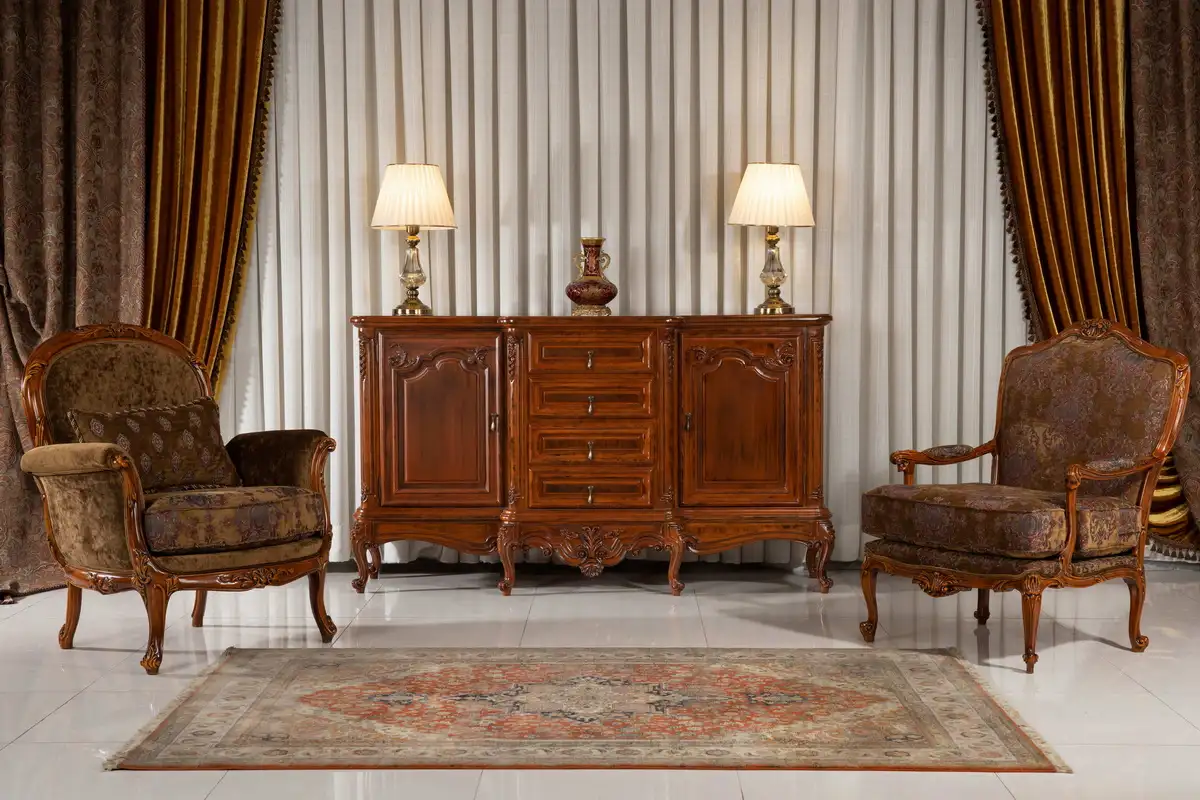 با توجه به اینکه این کنسول دارای ۴ عدد کشو در بخش میانی و ۲ کمد در اطراف آن است، فضای مناسبی را برای چیدمان ظروف پذیرایی به شما ارائه میدهد. یکی از عناصر کاربردی و دکوری در خانه، کنسول چوبی باواریایی در سبک کلاسیک مدل باواریایی است؛ این ترکیب نه تنها به فضای خانه شما جلوهای زیبا و با اصالت می بخشد بلکه با قرارگیری صحیح در فضای مناسب، تعادلی منحصر به فرد را با سایر اجزای دکوراسیون داخلی خانه شما ایجاد میکند.